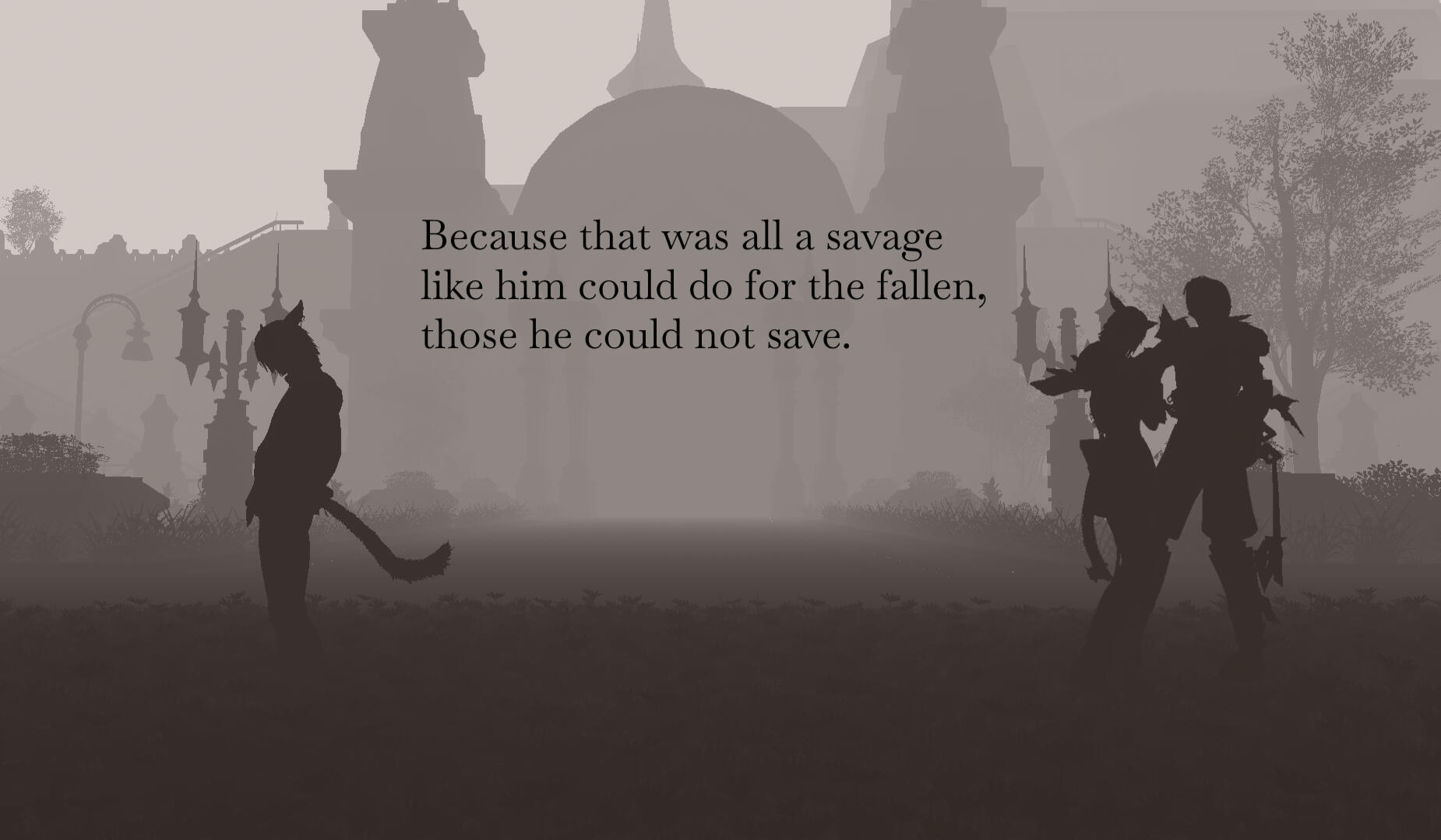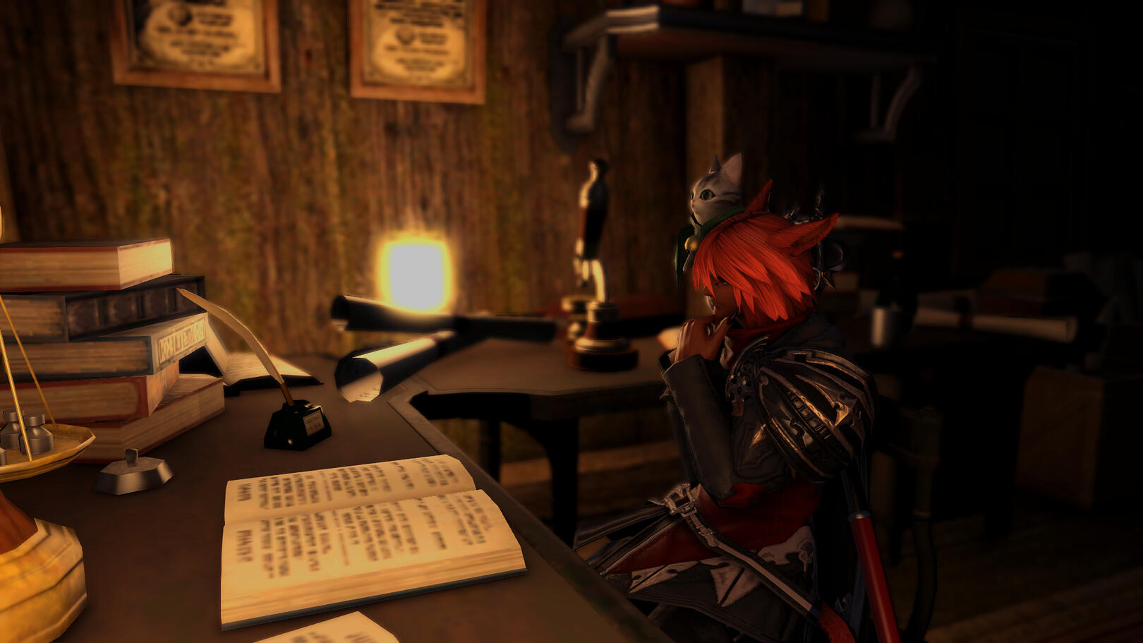 Hanging out with animals: After a night of dreaming of falling stars, Arden gained the Echo, allowing him to understand both Spoken and animal languages. Animals are simple and rarely ask for anything more than food and company - and throughout the few years since Ala Mhigo was freed, he's run into quite a few of them that are better off with him than anyone else. Arden is many things, but he isn't a monster. (Arden's Echo acts as an auto-translator - unless someone's speaking Eorzean or, to a lesser extent, Garlean, he doesn't realize he's understanding someone speaking a language he shouldn't know.)