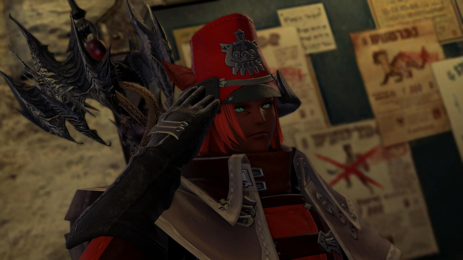 A mixture of Ala Mhigan heritage, impeccable grooming habits, and an innate sense of what's attractive and what isn't have made Arden's appearance turn heads on more than one occasion. It's easy to classify his looks as "sharp": bright emerald eyes catching every movement in front of him, fiery red hair growing as feathered spikes in front of his face, long claws painted black and left canine file-sharpened to resemble a Keeper's fang...Upon closer inspection, however, it's clear that if he wanted to claim the title of 'most beautiful man in Hydaelyn', he could do better. His hair has a fair amount of split ends, his teeth are crooked and stained, and his clothes and adornments wouldn't be sold for outrageous prices at stores. It all tells the story of someone who has trouble with making - and holding onto - money. Still, it's very clear he tries his best despite his budget (or lack thereof).Even with this limitation, Arden's found a way to show his fondness for the showy and dramatic. Open flowy shirts and robes, flashy pants, and strikingly black eyeliner and lip color are all parts of his style, gender norms be damned. Perhaps the most emblematic part of his style is the copious amount of jewelry he wears: from earrings to bracelets, to chains and tumbled gemstones adorning his luxuriously soft tail, it's practically impossible to look at him and not see gold glinting on his person. And those astute and trained in magic would be able to tell that every piece has been treated to be aetherically conductive...